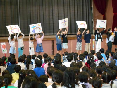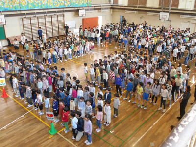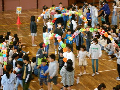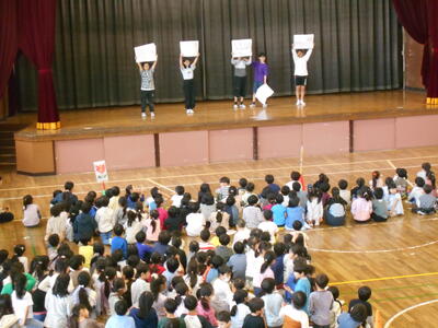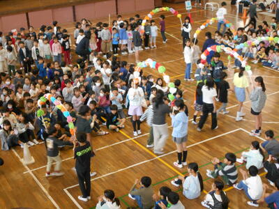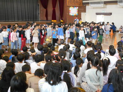 5月2日、1~6年生の全児童が初めて体育館に集まり、1年生を迎える会を行いました。代表委員会の出し物や、2~6年で分担して作ったプレゼントを1年生に贈呈するなど、心温まる会になりました。全校合唱の「さんぽ」は体育館中に歌声が響き渡り、圧巻でした。