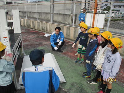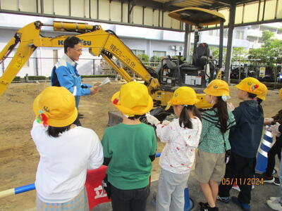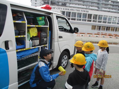 11月5日、1年生は国語科で学習している「はたらくじどう車」の内容を深めるために、様々な車を見学しました。近くのガス会社の協力を得て、写真や図鑑で見た車を間近で見ることができ、子どもたちは大喜びでした。