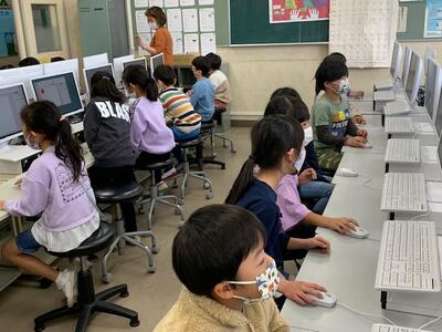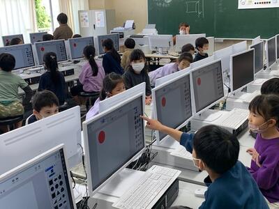 支援員の先生がお手本を見せます。みんな画面に注目します。