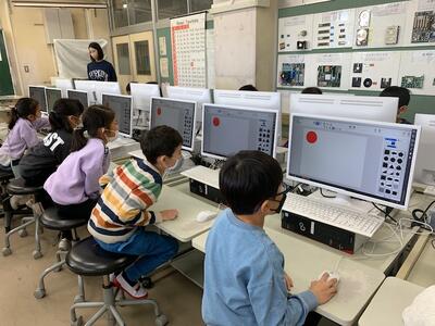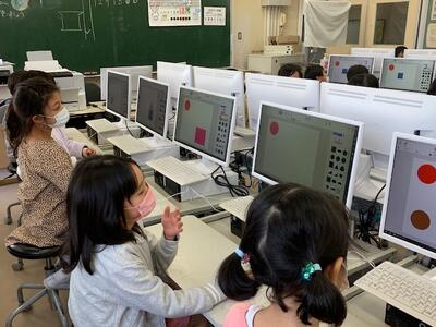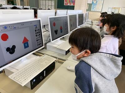 子どもたちも、四角形と三角形と丸の基本図を使って、画面上に絵を描いてみました。