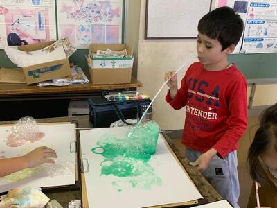 ぶくぶくと湧き出す色とりどりの泡を画用紙にそっとのせ、泡の模様をうつします。