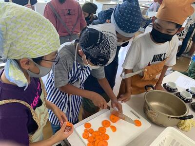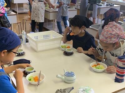 自分でドレッシングをつくるのは初めの子も多かったようですが、ゆでた野菜にかけていただくと、「おいしい~!」と笑顔になります。