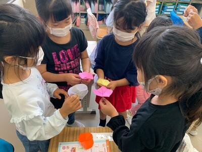 今日は、花の色や形をイメージしながら、折り紙でアサガオをつくりました。