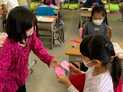 友だちと助け合いながら、なごやかに折り紙を楽しんでいます。