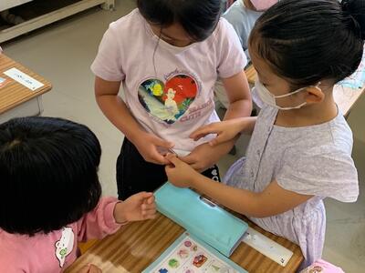 お手本を見せたり、針と糸を一緒に押さえてあげたり。