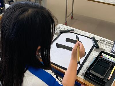 半紙の上で優しく筆を運びますが、力加減を調節するのが意外と難しいです。