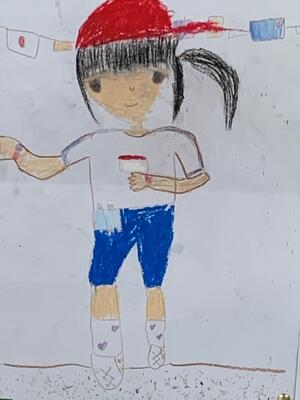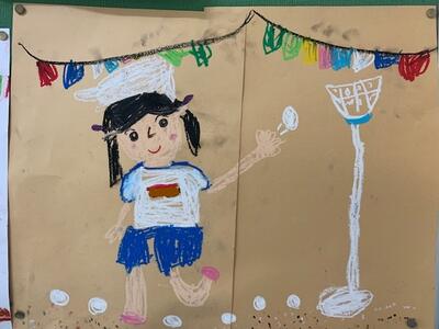 ダンスや玉入れ、かけっこ、リレーの思い出のワンシーンをクレヨンで描いたものです。