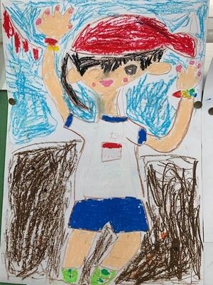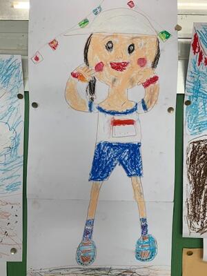 1枚に収まらなかったのか、縦や横に画用紙を継ぎ足して、足や手を描いている作品もあります。