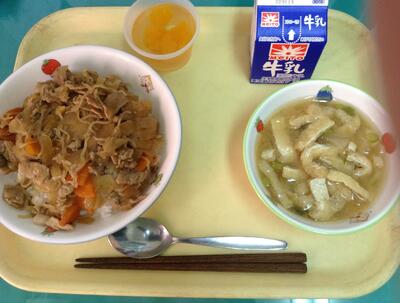 豚丼、みそ汁、みかんゼリー、牛乳
