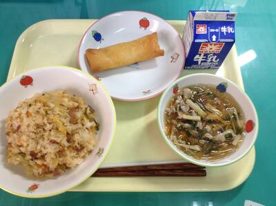 キムたくごはん、ポテト春巻き、春雨スープ、牛乳
