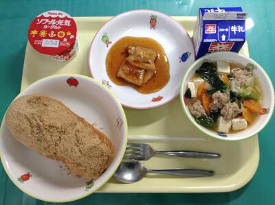 きなこ揚げパン、ローストチキン、肉団子スープ、ヨーグルト、牛乳