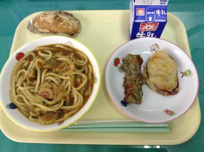 カレーうどん、天ぷら(ちくわ、さつまいも)、おはぎ、牛乳