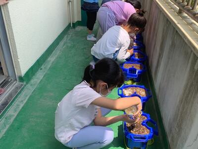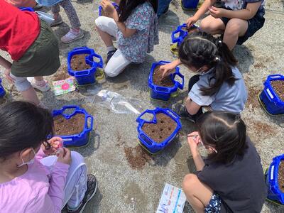1年生は生活科でアサガオを育てます。今日は種をまきました。