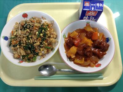 さつまいもごはん、鶏肉の香味焼き、白玉汁、牛乳