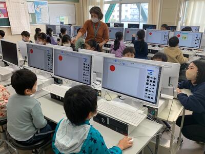 支援員の先生がお手本を見せます。みんな画面に注目します。