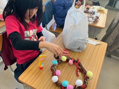サツマイモのつるでつくったリースに飾り付けをして、クリスマスリースをつくりました。
