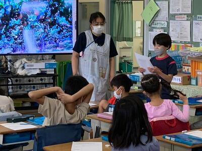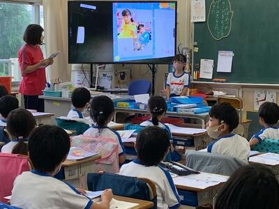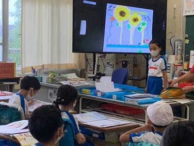 だれと、どこで、何をしたか。そのときの様子や感想などを発表用のシートにまとめ、その時の様子や感想を上手に話していました。中には、きれいな絵をモニターに映して説明をしてくれた子もいます。