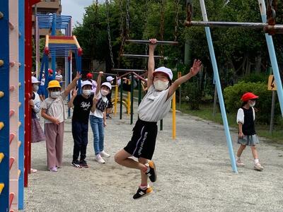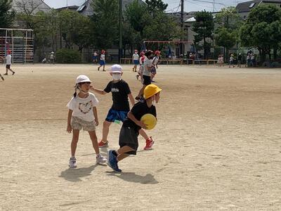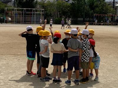 楽しそうな笑い声にひかれて校庭に出ましたが、動かなくても汗をかいてしまいます。