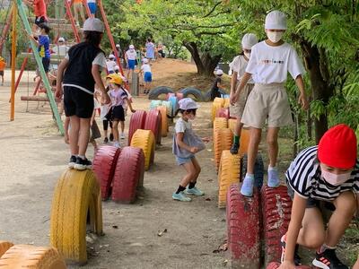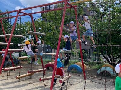 遊具で遊ぶ子どもたち。ドッジボール、先生と一緒にみんなで鬼ごっこ。