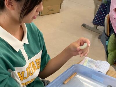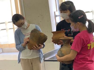 「土器ッと古代宅配便」で届けられた土器を見せていただきました。県内の遺跡から出土したなんと本物です。