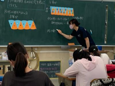 今まで学んできた、平行四辺形などの基本図形の面積の求め方、円周の求め方、円の対称性などの既習事項を振り返りながら、円の面積の公式を導き出しました。
