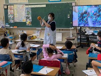 今日は本校の栄養教諭が「市川の梨」について説明をしました。