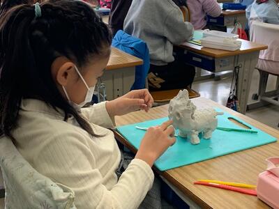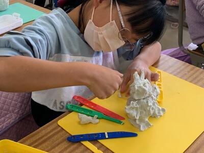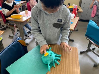 「むぎゅたん」という空想の生き物を粘土でつくりました。