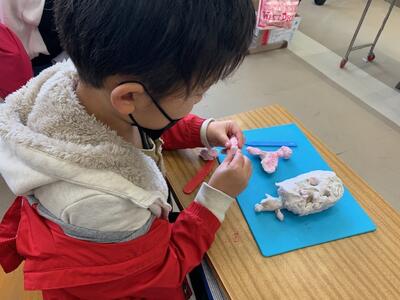 丸めたりひねったりつまんだり穴を開けたりして、自由に想像しながら「むぎゅたん」をつくっていました。