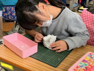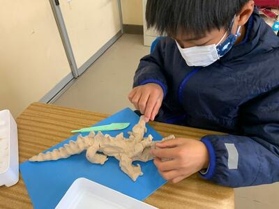どんな生き物か想像しながら、まず、大きな塊の粘土をむぎゅっとこねます。こねているうちにだんだんと「むぎゅたん」のイメージが膨らんだようです。