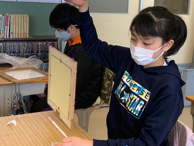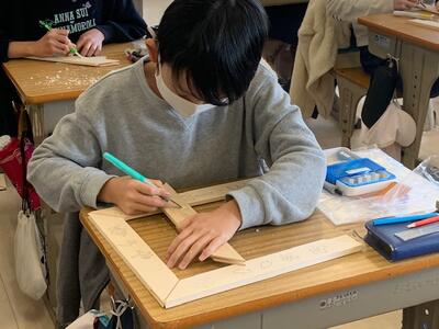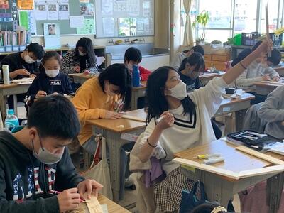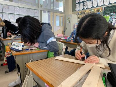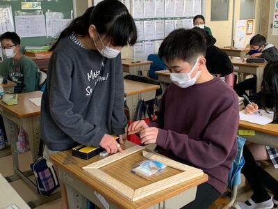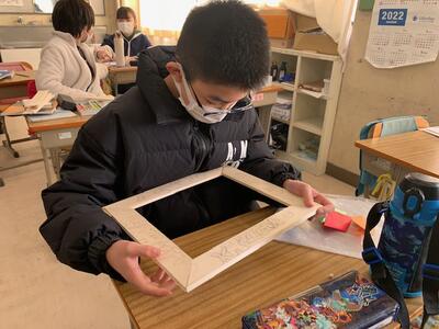 彫刻刀を使って模様を彫り、色紙額をつくります。