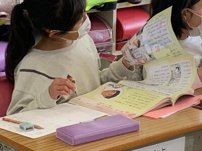 ドラえもんの作者として有名な藤子・F・不二雄さんのお話をもとに、あきらめないで取り組むことの大切さについて話し合っていました。