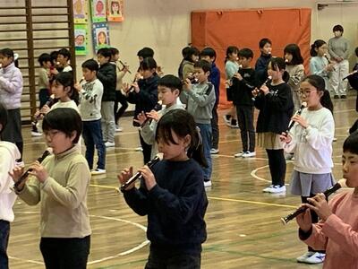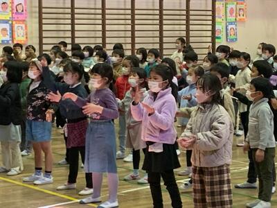 学年ごとに、呼びかけや歌、リコーダー演奏、ダンスなど、趣向を凝らした演出で、6年生へ感謝の気持ちを伝えました。