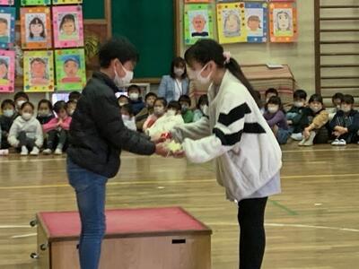 「旅立ちの日に」を合唱の後、これからの大洲小を託す思いを込め、5年生にバトンを渡しました。