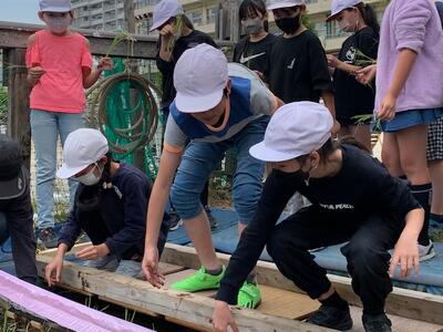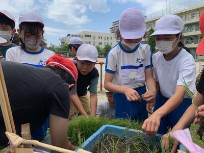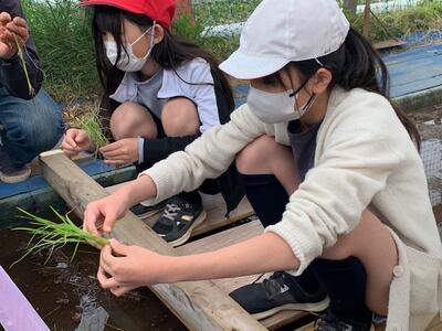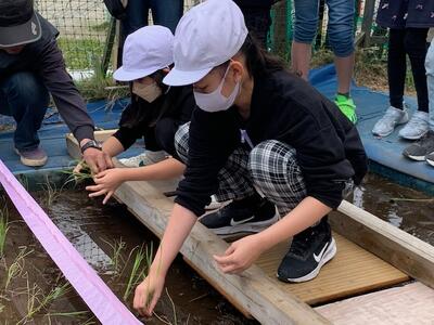 米作りに携わる方々の様々な工夫や苦労など、実感をともなう深い学びにするため、例年、田植え体験をします。
