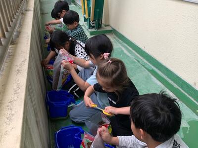 鉢をベランダにならべた後、「大きく育ってね」と、気持ちを込めながらペットボトルのじょうろで水やりをしました。元気に育ってほしいものです。