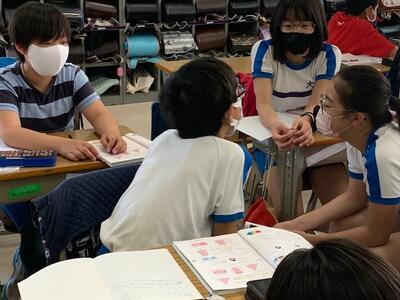 今日は、(a×8)÷2 ,a×(8÷2) ,(a÷2)×8 の文字を使った式3つを読み取り、それぞれ、どのように三角形の面積を求めたかを考えました。