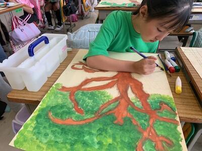 今日は、たくさんの色を塗り重ねた幹や枝に、葉を描きました。