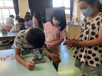メダカのオスとメスはせびれとしりびれで見分けがつくことを学んだ5年生。