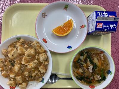 (献立): 麻婆丼、牛乳、春雨スープ、オレンジ