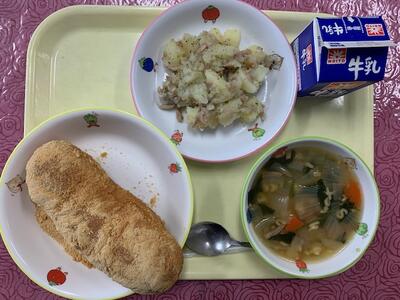 (献立): きな粉揚げパン、牛乳、ジャーマンポテト、マカロニスープ