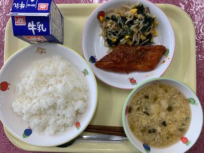 (献立): ごはん、牛乳、ヤンニョムフィッシュ、もやしのナムル、たまごのスープ