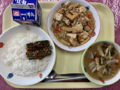 (献立): ごはん、牛乳、生揚げの炒め物、胡瓜のおかか和え、味噌汁