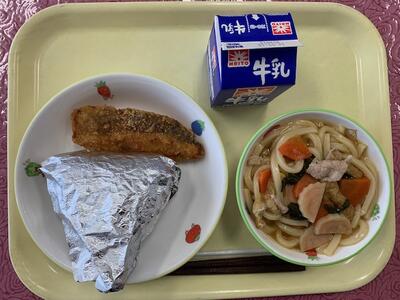 (献立): 茶飯のおにぎり(防災給食)、牛乳、煮込みうどん、たらの竜田揚げ