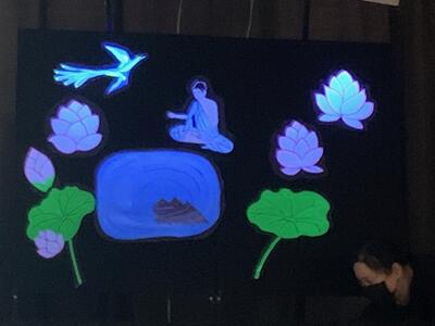 最後に、芥川龍之介の「蜘蛛の糸」のお話を、ブラックシアターを使って読んでくれました。
