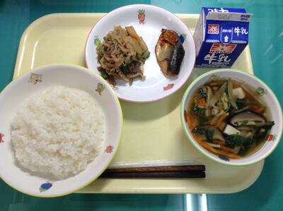 ごはん、サバの生姜焼き、切り干し大根の煮物、沢煮椀、牛乳