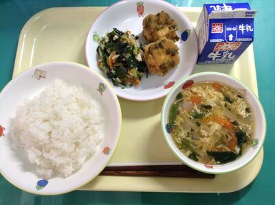 ごはん、揚げだし豆腐、和風サラダ、かき玉汁、牛乳