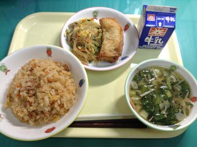 キムチごはん、春巻き、バンサンスー、五目スープ、牛乳