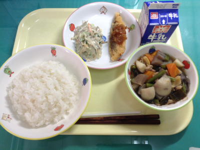 ごはん、タラのねぎソースがけ、ごぼうサラダ、筑前煮、牛乳