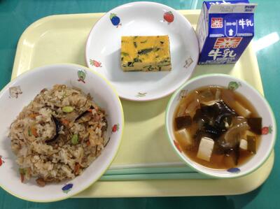 切干大根ごはん、厚焼きたまご、味噌汁、牛乳