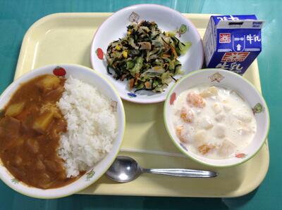 有機野菜カレー、ひじきサラダ、フルーツヨーグルト、牛乳